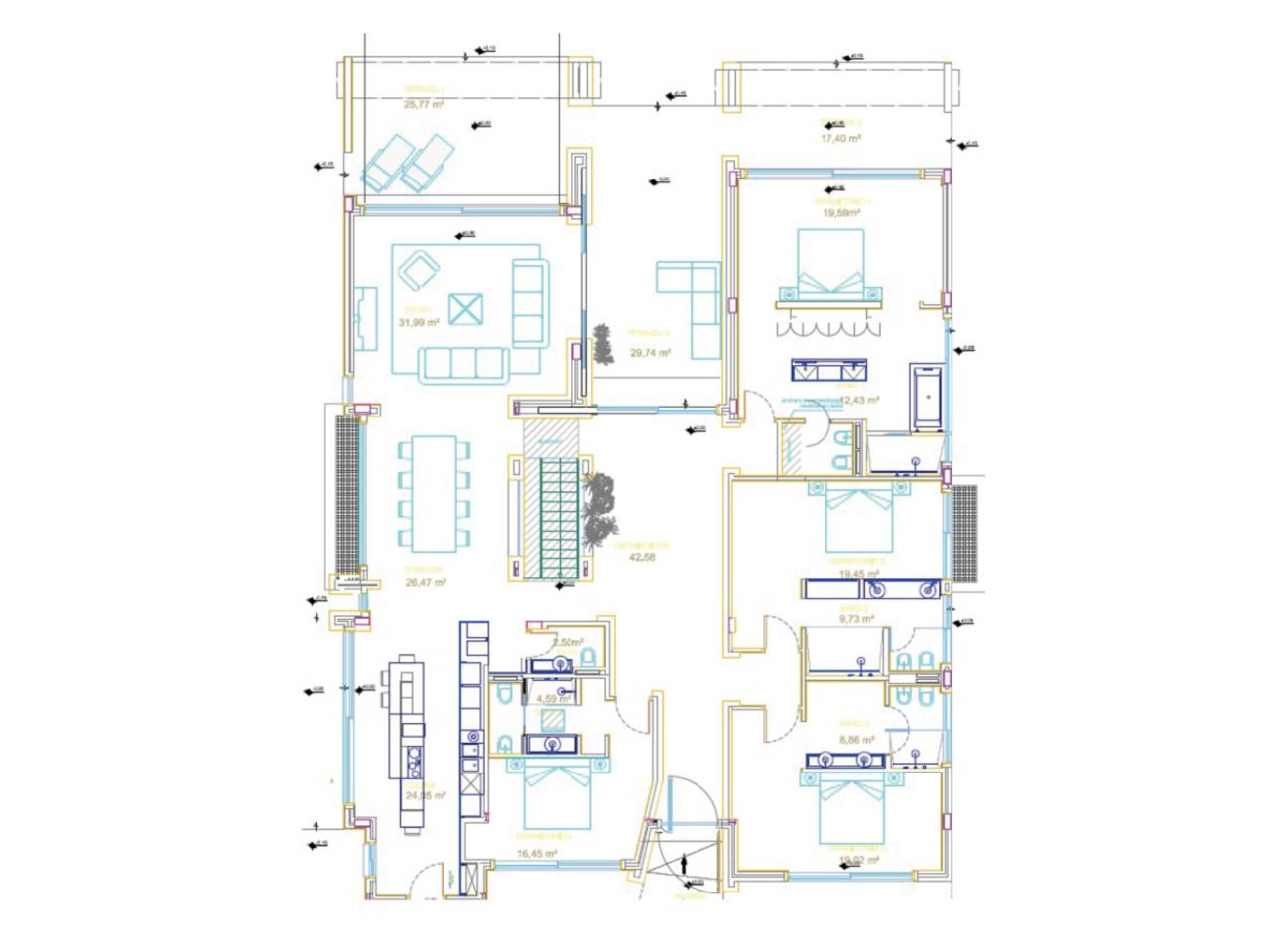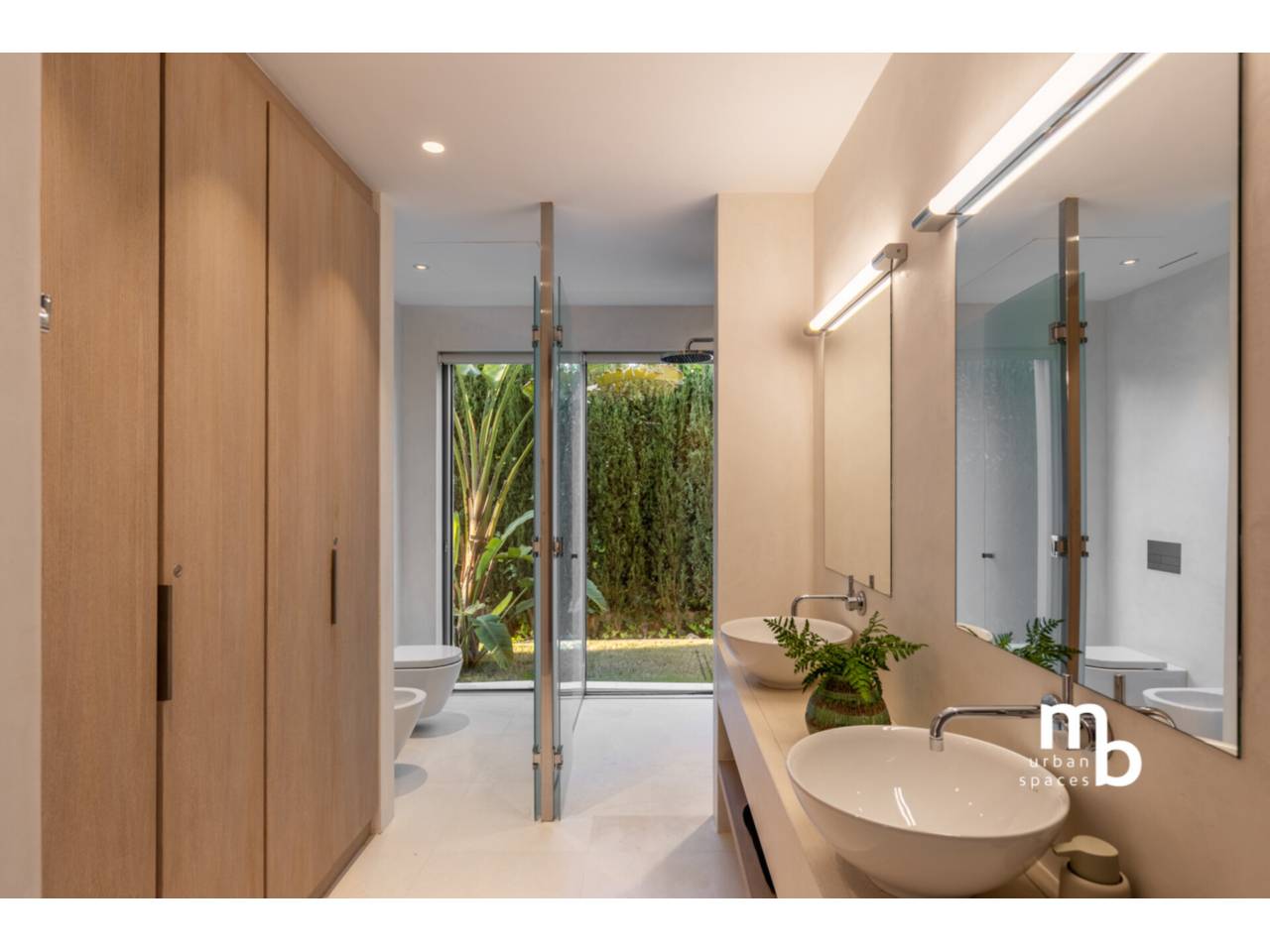 En la planta principal, con doble puerta de entrada accedemos a varios porches exteriores y al jardín con espectaculares vistas al mar. En esta planta también se encuentran cuatro dormitorios, todos ellos con baño en suite y armarios empotrados.